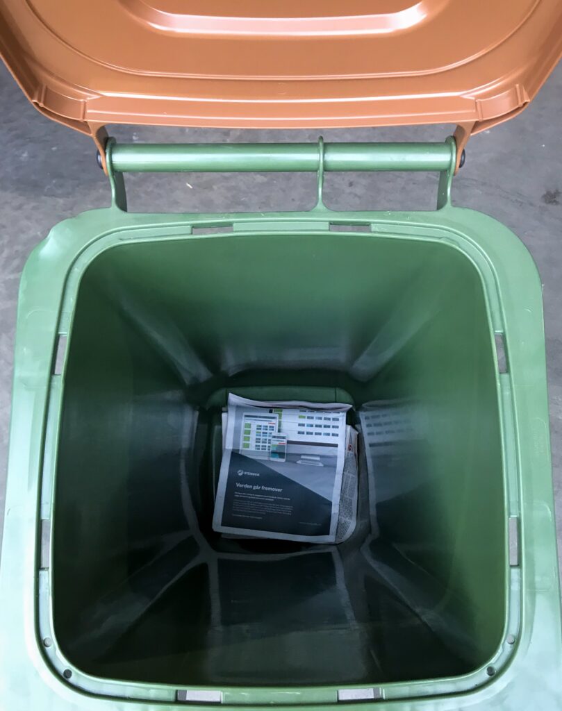 Du kan hjelpe til ved å legge avispapir eller eggekartong i botnen av dunken for våtorganisk avfall. Dette kan hindre avfallet i å fryse fast, og sikre at dunken vert skikkeleg tømt.